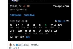 本場(chǎng)比賽,庫(kù)里轟下46+5+5;在昨日被雷霆暴揍的比賽中,一位叫HoodiiBron的網(wǎng)友曬出庫(kù)里的數(shù)據(jù)截圖,并表示:“退役吧兄弟?!?/p>