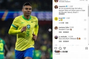 卡塞米羅社媒曬出比賽照片,寫道:“全隊(duì)都表現(xiàn)出色,向世界杯又邁進(jìn)一步!加油巴西!”