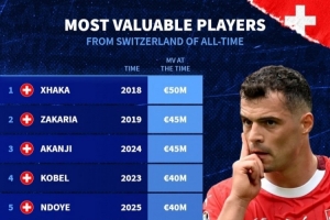 體育資訊11月16日訊 日前,德國轉會市場統計了瑞士球員歷史最高身價排行,扎卡5000萬歐居首。