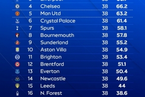 天空體育預(yù)測本賽季英超最終排名(積分為模擬10萬次的平均值)