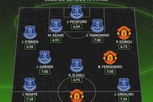 中場(chǎng):詹姆斯·加納 (埃弗頓, 7.00分)、基爾南·迪尤斯伯里·霍爾 (埃弗頓, 6.91分)、布魯諾·費(fèi)爾南德斯 (曼聯(lián), 7.08分)