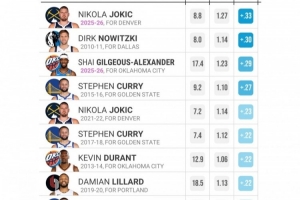 在前9中,庫里三次上榜,分別是15-16賽季的+0.27分、17-18賽季的+0.22分、20-21賽季的0.22分。