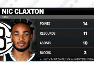 據(jù)統(tǒng)計(jì),這是21-22賽季杜蘭特和哈登后,籃網(wǎng)首位單賽季至少2次三雙的球員。