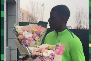 今天,法比奧特地找到訓練基地負責洗衣的工作人員邵紅和陳玉敏,向兩位大姐獻花,感謝她們無微不至的照顧。??????