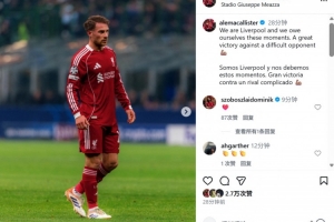本場比賽麥卡利斯特表現(xiàn)不俗,他也在個人社媒曬出本場照片,配文寫道:“我們是利物浦,我們值得這樣的時刻。對陣強敵取得了一場很棒的勝利!”