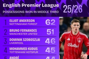 本賽季英超中場區(qū)域奪得球權榜:安德森居首,B費、索博前三