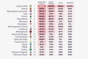 體育資訊12月12日訊 opta在當(dāng)?shù)貢r(shí)間12月11日對(duì)本賽季歐聯(lián)杯形勢(shì)進(jìn)行了新的預(yù)測(cè),阿斯頓維拉奪冠概率達(dá)到34.3%,羅馬8.6%第二。