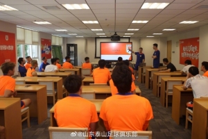 7月9日下午,球隊(duì)在訓(xùn)練開始前,泰山足校西班牙籍青訓(xùn)總監(jiān)埃里克在會(huì)議室對(duì)球隊(duì)前一天的訓(xùn)練進(jìn)行復(fù)盤總結(jié),并與全體隊(duì)員分享了訓(xùn)練中的理念、要求和方法,會(huì)后到場(chǎng)地配合教練組一起共同完成訓(xùn)練任務(wù)。