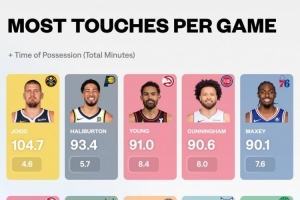 其中約基奇以場(chǎng)均104.7次觸球排名聯(lián)盟第一,持球時(shí)間為4.6分鐘;哈利伯頓場(chǎng)均觸球93.4次,持球5.7分鐘排名第二;特雷-楊91次觸球(持球8.4分鐘)排名第三。數(shù)據(jù)顯示,杰倫-約翰遜是榜單中單次觸球所需時(shí)間最少的球員,約老師則是第二。