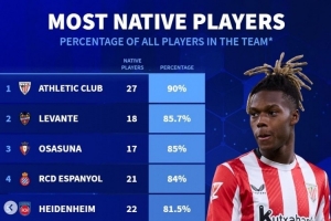 體育資訊7月13日訊 《轉(zhuǎn)會市場》統(tǒng)計了當(dāng)前五大聯(lián)賽一線隊本土球員占比情況,畢巴是唯一超過9成的球隊。