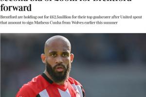 布倫特福德對姆貝莫的標(biāo)價為6250萬英鎊,與曼聯(lián)今夏為庫尼亞支付的轉(zhuǎn)會費(fèi)相同。