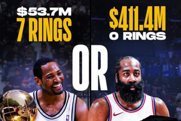 詹姆斯-哈登的(薪資)收入已經(jīng)超過了4.11億美元,但NBA生涯至今冠軍數(shù)仍是0。
