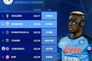 體育資訊7月31日訊 奧斯梅恩轉(zhuǎn)會(huì)加拉塔薩雷只待官宣,《轉(zhuǎn)會(huì)市場》也統(tǒng)計(jì)了那不勒斯隊(duì)史最貴賣人情況,伊瓜因仍居首。