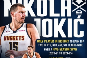 據(jù)統(tǒng)計(jì),約基奇在2020-21賽季至2024-25賽季這5個(gè)賽季中,總得分、籃板、助攻和搶斷數(shù)都排名聯(lián)盟前二!他也是歷史唯一一人!具體數(shù)據(jù)如下: