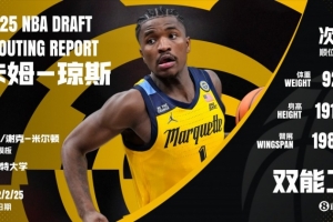 卡姆-瓊斯是來自馬奎特大學的大齡即戰(zhàn)力后衛(wèi),技術成熟度高,對擋拆的運用與終結的創(chuàng)造力能達到NBA層級,但運動能力是他的最大短板。進入NBA后,球隊可能需要在防守端把他“藏一藏”,避免其頻繁遭遇擋拆或換防的場景,會比較適配中鋒蹲坑的五外體系,可以充當打10-15分鐘的替補持球手角色,但23歲的年紀基本上沒有太多的改造空間,手握次輪簽的球隊完全可以將其視作板凳奇兵押上一注。