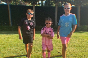 麗貝卡社媒曬出三個(gè)孩子的照片,孩子們都身穿邁阿密?chē)?guó)際球衣。