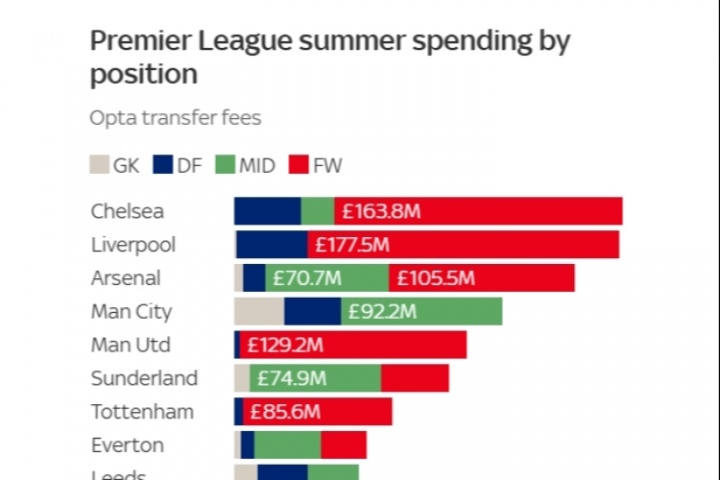 體育資訊08月08日訊 今夏英超聯(lián)賽在轉(zhuǎn)會市場上投入巨大,天空體育統(tǒng)計(jì)了英超各隊(duì)今夏的轉(zhuǎn)會支出,并將各隊(duì)支出按位置進(jìn)行分類。