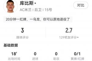 上半場,米蘭首發(fā)的21歲中衛(wèi)庫比斯先是在定位球防守中不慎烏龍,隨后又作為最后一名球員拉倒若昂-佩德羅,被出示直紅罰出場外,使球隊(duì)被迫陷入十人作戰(zhàn)的情況。此外,球隊(duì)第2個(gè)丟球中他也犯了盯人不緊的錯(cuò)誤。