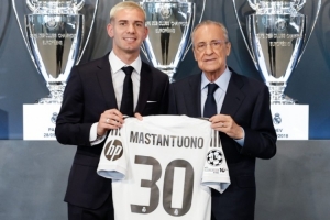 體育資訊8月14日訊 北京時間今晚19點(diǎn),皇馬新援馬斯坦托諾在皇馬正式亮相?;蜀R主席弗洛倫蒂諾在新聞發(fā)布會上談到了從河床簽下的馬斯坦托諾。