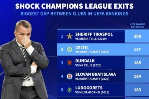 體育資訊8月28日訊 歐冠附加賽次回合,凱爾特人在點球大戰(zhàn)中不敵阿拉木圖凱拉特,目送對手隊史首次闖進歐冠正賽。根據(jù)德國轉(zhuǎn)會市場的統(tǒng)計,凱爾特人本次被淘汰是歐冠歷史交鋒兩隊歐足聯(lián)積分差距第二大。