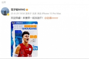 范子銘更新個人微博,歡迎了新隊友的到來,寫道:“歡迎我睿!新賽季一起加油干!”