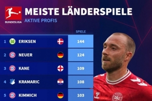 德甲現(xiàn)役球員國(guó)家隊(duì)出場(chǎng):埃里克森144場(chǎng)最多,諾伊爾、凱恩前三