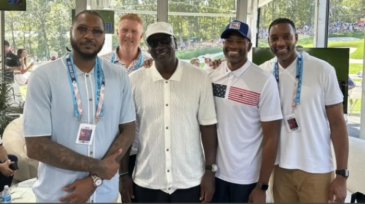 j體育資訊9月29日訊 今日,NBA傳奇球星邁克爾-喬丹、卡梅隆-安東尼、特雷西-麥克格雷迪、文斯-卡特和布萊恩-斯卡拉布賴恩現(xiàn)身貝斯佩奇黑球場(chǎng),參加萊德杯第三天的比賽!