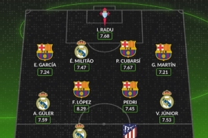中場:居勒爾(皇馬)7.59分、費爾明(巴薩)8.29分、佩德里(巴薩)7.45分、維尼修斯(皇馬)7.53分