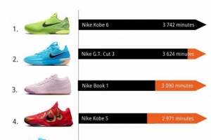 值得一提的是,在相關(guān)NBA的統(tǒng)計中,科比球鞋同樣是占據(jù)前列。