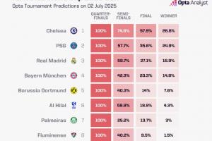 體育資訊07月02日訊 世俱杯8強(qiáng)結(jié)果出爐,opta更新了各家豪門晉級(jí)和奪冠概率。身處上半?yún)^(qū)的切爾西奪冠概率登頂,其他4家歐洲球隊(duì)分列2-5名。