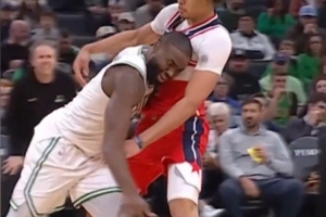 發(fā)際線粉事件之一:對陣奇才時(shí)杰倫·布朗發(fā)際線粉粘到對手白T上