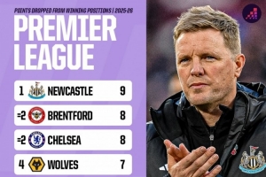 本賽季英超領(lǐng)先之后丟分榜:紐卡9分最多,小蜜蜂、切爾西8分