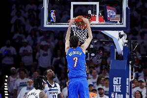 雷霆內(nèi)線霍姆格倫上半場表現(xiàn)活躍,不僅有突破單手劈扣的精彩表現(xiàn),籃板拼搶和防守上也充分發(fā)揮他的身高優(yōu)勢和靈活性。