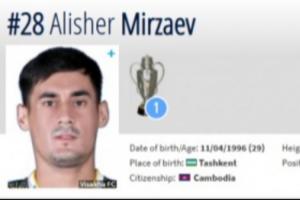 米爾扎耶夫現(xiàn)年29歲,司職中場,2019年1月前往柬埔寨聯(lián)賽毗沙卡FC效力,已為球隊出戰(zhàn)82次,貢獻5球7助攻,德轉身價15萬歐。根據(jù)國際足聯(lián)官方消息,米爾扎耶夫的國際足聯(lián)會籍已由烏茲別克斯坦轉換為柬埔寨。