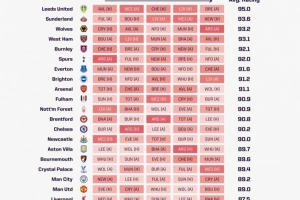 OPTA為各隊未來5輪聯(lián)賽的困難程度進(jìn)行了量化打分,利茲聯(lián)賽程95.0分最困難,桑德蘭(93.6分)、狼隊(93.2分)、西漢姆(93.1分)、伯恩利(92.1分)分列二到五位。