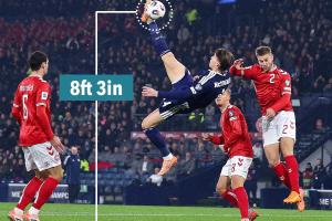 據(jù)太陽報(bào)統(tǒng)計(jì),麥克托米奈倒鉤時(shí)腳部高度達(dá)到了8英尺3英寸(約2.53米),比C羅在皇馬時(shí)對陣尤文的倒鉤高度(7英尺7英寸,約2.38米)還要高。
