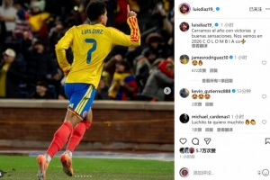 迪亞斯社媒曬出慶祝進球的照片,配文:“我們以勝利和美妙的感覺為2025年收官,2026年見,哥倫比亞球迷們!”