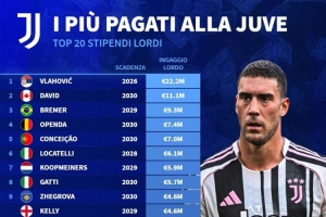 尤文稅前年薪排名:弗拉霍維奇2220萬歐居首,戴維1110萬歐次席
