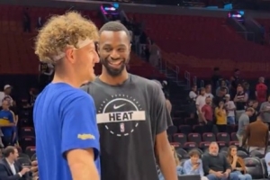 賽前,勇士后衛(wèi)波杰姆斯基找到了熱火球員、前隊(duì)友維金斯,兩人笑著寒暄了數(shù)句。