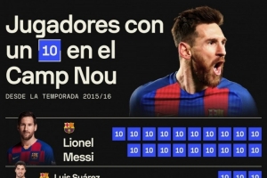 體育資訊11月22日訊 巴薩即將重返諾坎普,Sofascore統(tǒng)計了2015-2016賽季以來球員在諾坎普球場比賽中獲評10分的場次,并列出榜單,梅西19場居首。