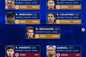 德轉(zhuǎn)列阿森納傷病名單:加布里埃爾等3人傷缺,約克雷斯等5將存疑