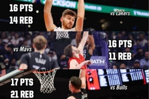 開拓者官推曬克林根過去五場兩雙數(shù)據(jù):得分?籃板?他全都要!