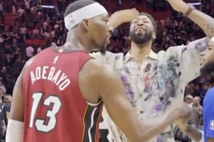 GIF-濃眉和阿德巴約擁抱 向觀眾臺(tái)獻(xiàn)飛吻 還尖笑