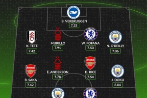 后衛(wèi):肯尼·泰特(富勒姆,7.42分)、穆里略(諾丁漢森林,7.91分)、韋斯利·福法納(切爾西,7.53分)、奧賴利(曼城,7.36分)