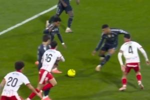 西甲第14輪,皇馬客場1-1戰(zhàn)平赫羅納,讀秒階段皇馬獲得絕殺機會,貝林厄姆禁區(qū)橫敲,正對球門的羅德里戈調整步點準備射門,這時正對來球但側對球門的姆巴佩半路殺出,轉身兜射打偏。