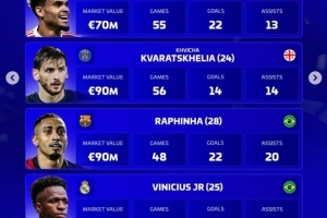 拉菲尼亞(巴薩,28歲,巴西):身價9000萬歐,48場,22球,20助攻