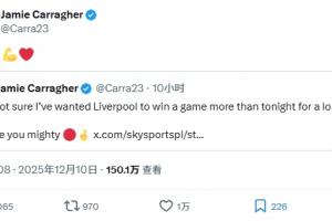 卡拉格轉(zhuǎn)發(fā)“從沒這么希望利物浦贏球”推文,并配文:拿下