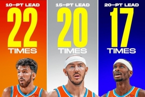 恐怖統(tǒng)治力!雷霆25場比賽中已17次領(lǐng)先對手20+&15次領(lǐng)先15+