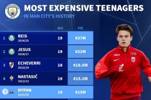 體育資訊7月18日訊 曼城已經(jīng)官宣簽下18歲挪威中場(chǎng)天才尼潘,數(shù)據(jù)統(tǒng)計(jì)顯示他也是曼城隊(duì)史第5貴的U20球員。