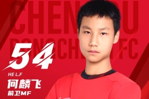何麟飛,2009年1月19日出生于四川成都 ,身高172cm,體重60kg,司職進(jìn)攻型中場(chǎng)。此前,何麟飛代表成都蓉城足球俱樂(lè)部U16梯隊(duì)出場(chǎng)60場(chǎng),貢獻(xiàn)13粒進(jìn)球、18次助攻,在傳射方面都展現(xiàn)出一定的特點(diǎn)。何麟飛出自成都本土青訓(xùn),具有較好的領(lǐng)導(dǎo)能力,在多場(chǎng)比賽中擔(dān)任球隊(duì)隊(duì)長(zhǎng),并多次獲得單場(chǎng)最佳球員。何麟飛曾帶領(lǐng)球隊(duì)獲得2022年省錦標(biāo)賽冠軍、2023年省運(yùn)會(huì)冠軍、2024年中國(guó)足協(xié)青少年足球錦標(biāo)賽季軍、2024年第四屆貢嘎杯冠軍以及2024年省錦標(biāo)賽冠軍。2024年,何麟飛曾入選U15男足國(guó)家隊(duì)第四期集訓(xùn),并隨球隊(duì)赴韓國(guó)進(jìn)行拉練。何麟飛的到來(lái),將為成都蓉城B隊(duì)中前場(chǎng)提供有力的支持,注入更強(qiáng)大的戰(zhàn)斗力。
